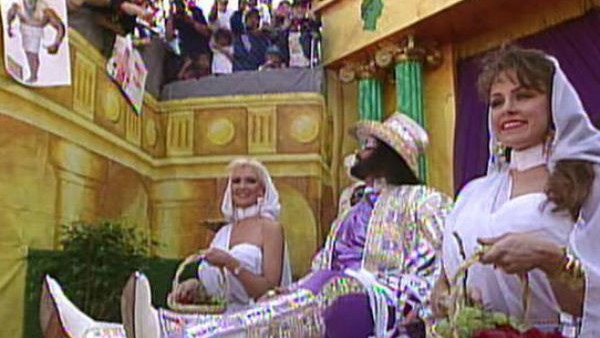 Randy Savage was known for his lavish entrances and crazy colored ring gear, but ‘The Macho King’ took it one step further at Wrestlemania IX when he lay on a bed pulled by horses and fed grapes by two beautiful women… no, really.