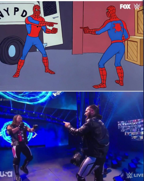 During a segment involving Jeff Hardy, Rollins and Styles walked by each other on the entrance ramp and had this exchange, which then led to comparisons to one of the most recognised social media memes out there today.