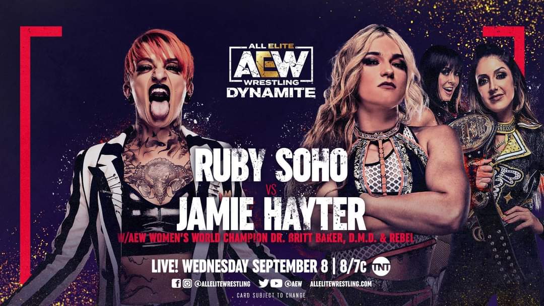 Earlier in the night Ruby did an interview and it was mentioned that she sent out an open challenge to prove she belongs and Jamie Hayter answered the challenge. The interview is interrupted by Britt, Hayter, and Rebel. Ruby discusses how she helped Britt break into the business and she discusses all of Britt’s nicknames, and Britt says Ruby calls herself The Runaway and says she run away to catering like she did the last four years and warns her that Hayter will beat her tonight. Ruby tells Tony Schiavone that he knows Britt is her girl but she’s gonna whoop her.