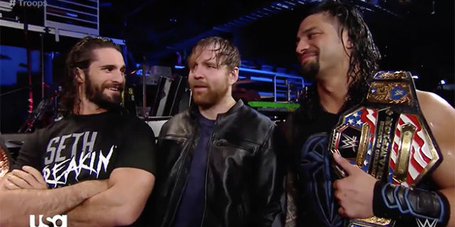 Rollins, Reigns & Ambrose stand tall in the ring, all put their fists in as one as The Shield’s entrance theme hits.