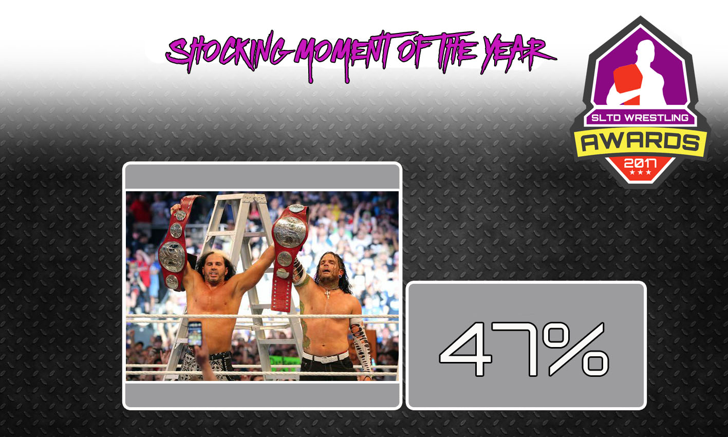 With 47% of the vote, the Hardy Boyz returning at WrestleMania 33 has been voted the most shocking moment of 2017! After their fantastic run in TNA with Total Deletion and beginning their quest for gold not many expected their music to hit for the RAW Tag Team Championship Ladder match and even fewer would have guessed that they would have gone on to become the champs! Every single fan in attendance and watching at home marked out at both these moments as they got to see the Hardy Boyz returning home!