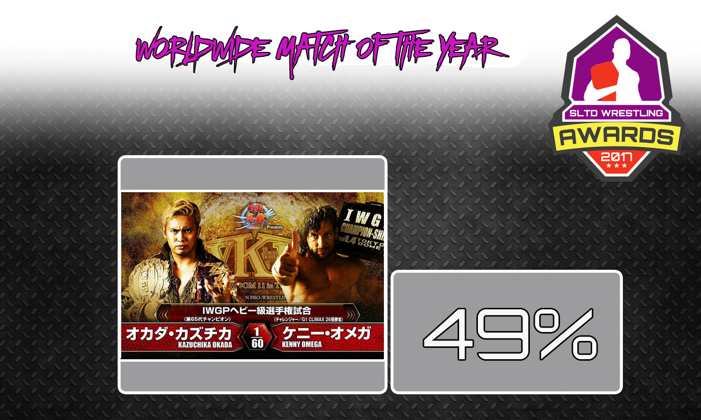 With 49% of the vote, Kazuchika Okada vs Kenny Omega for IWGP Heavyweight Championship at Wrestle Kingdom 11 was voted the Worldwide Match of the Year. With Omega winning the Worldwide Superstar of the Year, it’s not shocking that his match at the biggest night in the NJPW calender would be voted the best match. Omega and Okada tore the house down in this match after Omega ‘cashed-in’ his G1 Climax briefcase.